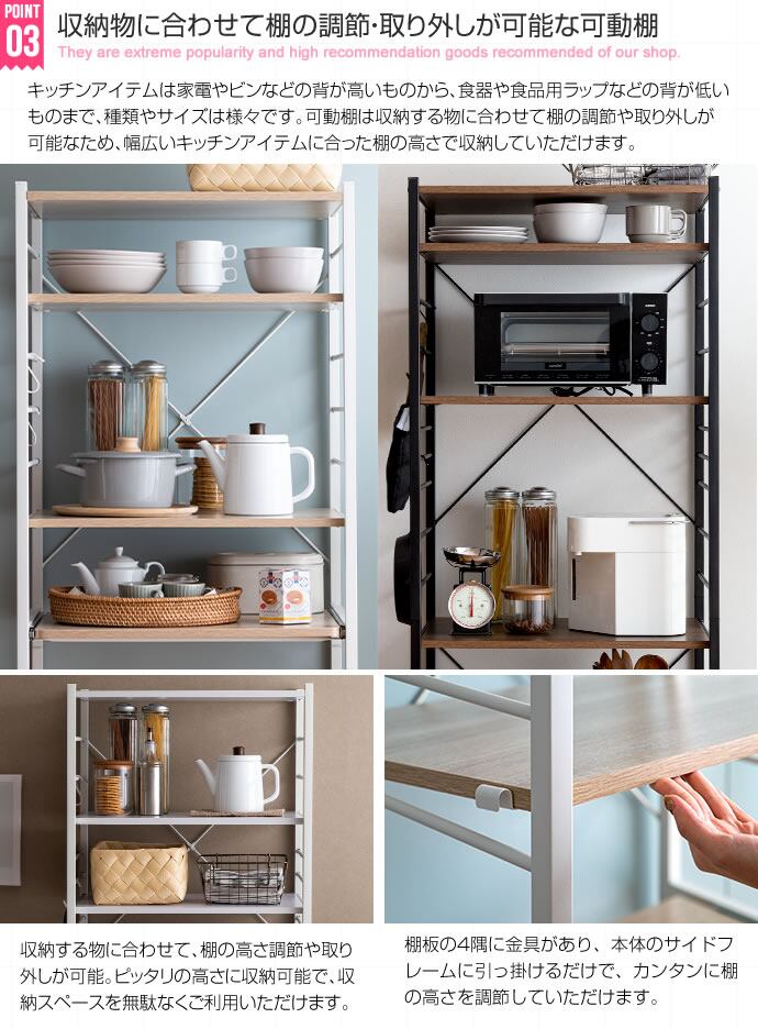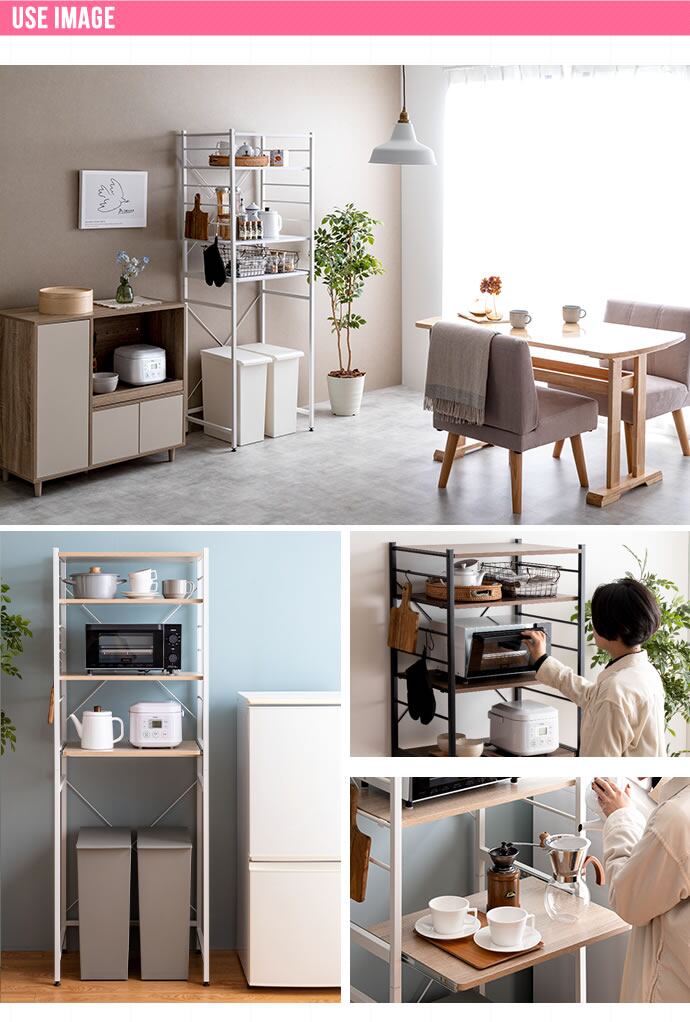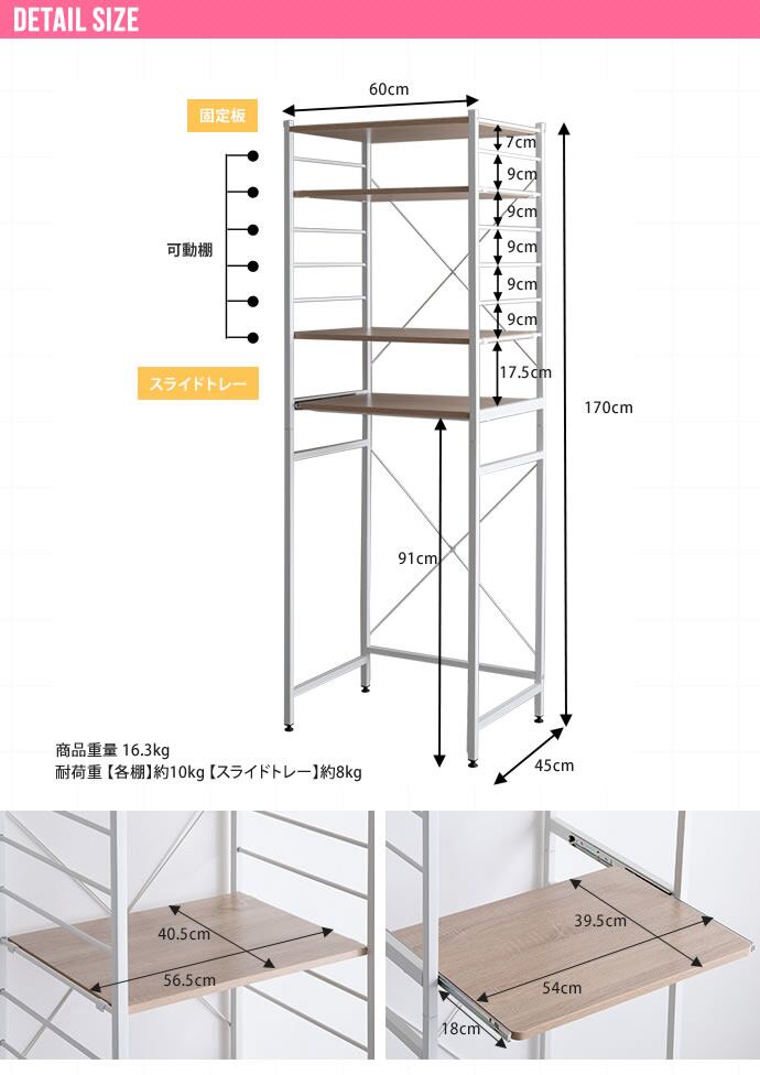 【耐荷重】各棚:約10kg、スライドトレー:約8kg
