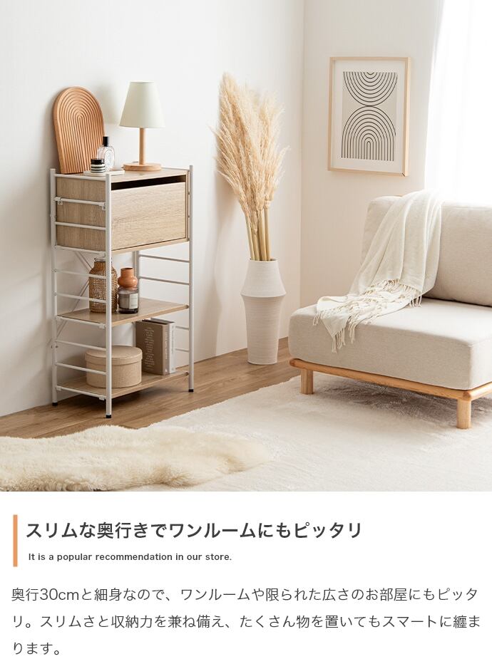 機能的で洗練された空間を作る『Laulu(ラウル)』引き出し付きシェルフ。圧迫感の無い抜け感のあるデザインがお部屋に馴染みやすく、インテリアをおしゃれに引き立てます。コンパクトながらも収納力抜群で、一人暮らしやワンルームにもピッタリです。