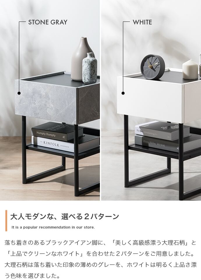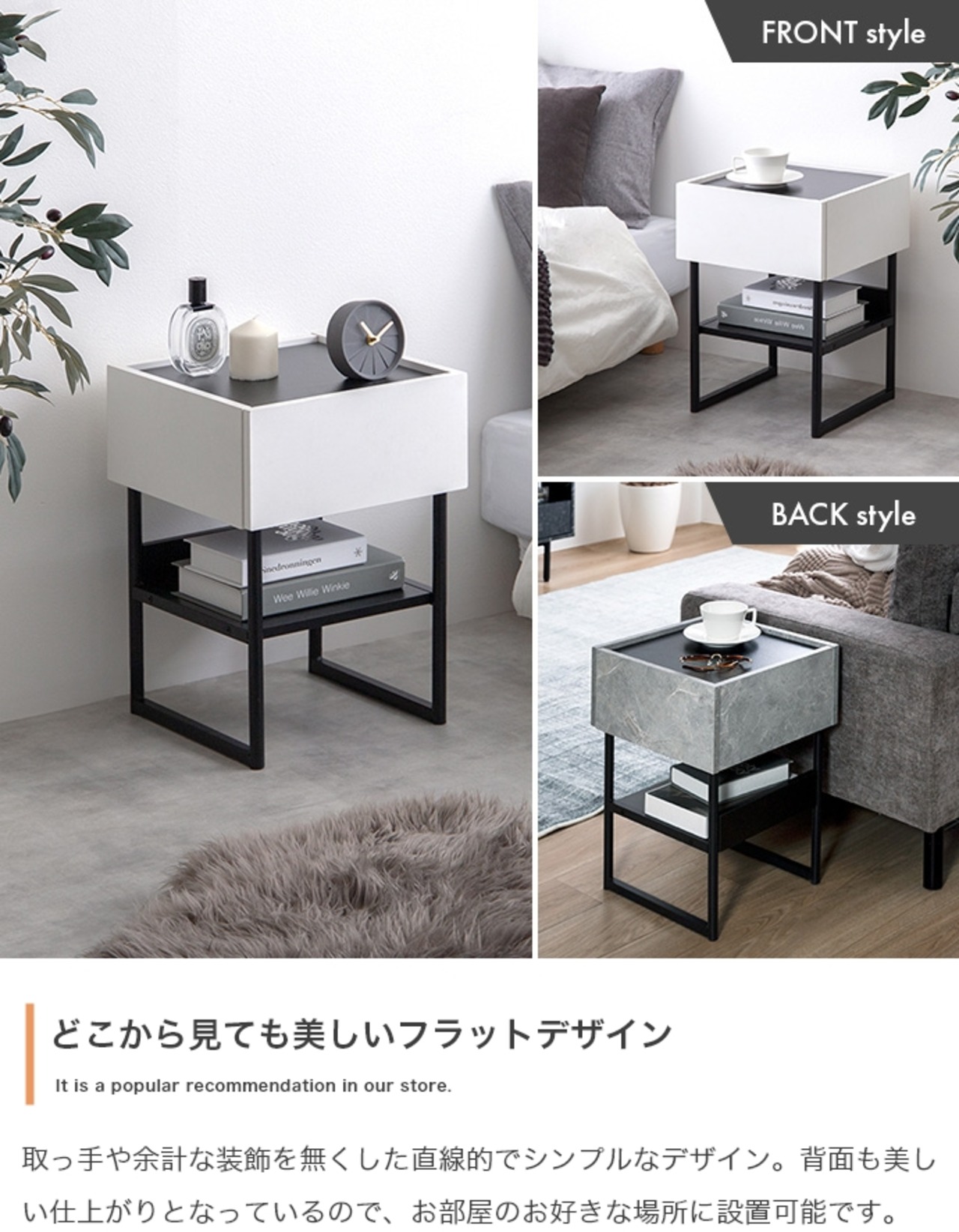 大人モダンな雰囲気が特徴の『Zele(ゼル)』サイドテーブル。直線的でシンプルな見た目ながら、引き出しとオープン棚付きでデザイン性だけでなく機能面にもこだわりました。背面も美しい仕上がりになっているので、お部屋のお好きな位置に設置可能です。ソファ横で飲み物やスマホなどを置いたり、ベッド横で時計や眼鏡を置く宮棚の代わりにしたり、様々なシーンで活用できます。