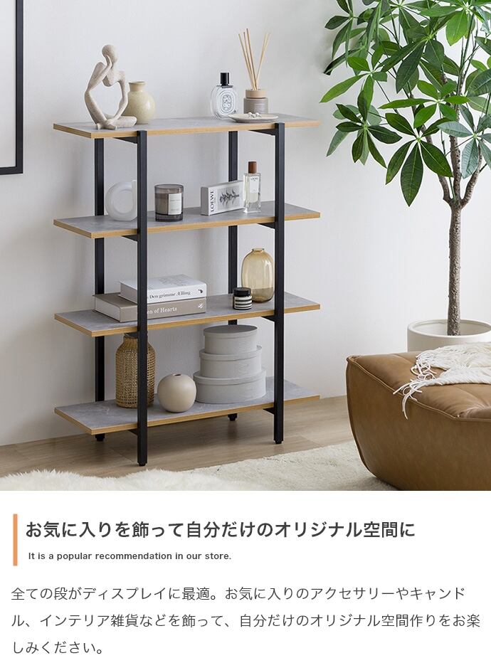 ヴィンテージ感のある木目調とストーン調の組み合わせが、お部屋をおしゃれに演出する『Pesci(ペッシ)』シリーズのオープンラック4段。仕切りがないオープンタイプのため、配置や方向を気にせずに収納ができ、お部屋の中に別空間やプライベート空間を作る間仕切りとしてもご使用いただけます。また、コンパクトで置きやすいサイズ設計なので、一人暮らしやワンルームにお住まいの方にもピッタリです。