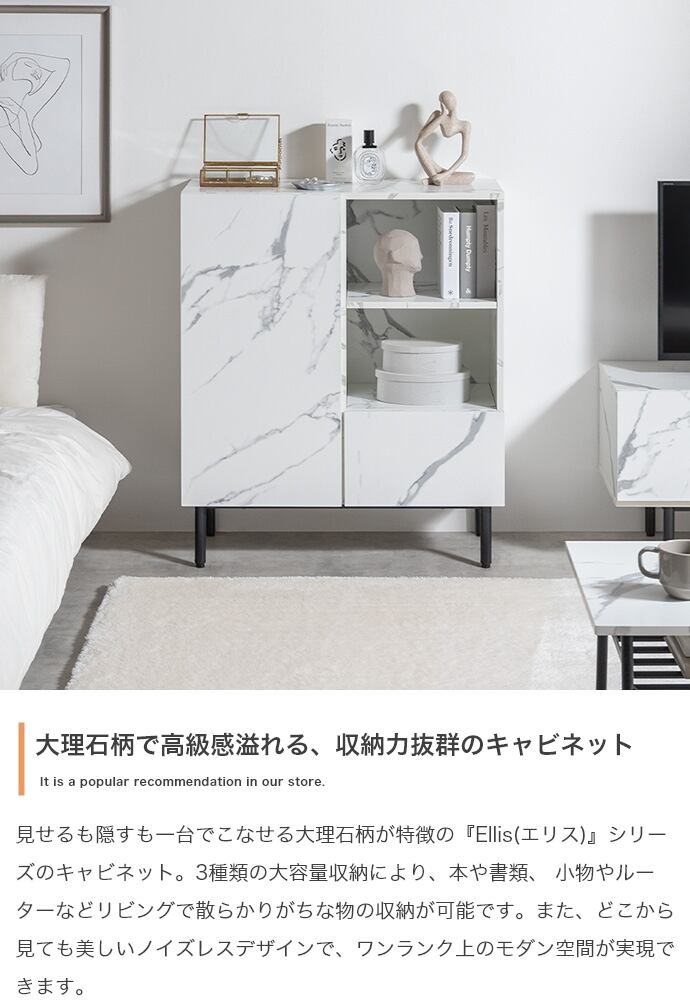 大理石柄がスタイリッシュで美しい『Ellis(エリス)』シリーズのキャビネット。どこから見ても美しいノイズレスデザインが、モダンで高級感漂う空間を演出します。用途やサイズごとに仕分けができる3種類の収納エリアを設け、本や書類、小物なども纏めて収納できます。扉収納にはコード穴が開いているので、Wi-Fiルーターなどの収納にもピッタリ。幅72cmとコンパクトなので、ワンルームなど限られたスペースにもすっきり置いていただけます。