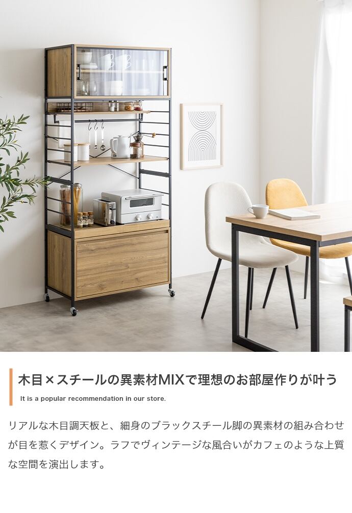 ヴィンテージ感漂う『Carter(カーター)』シリーズの食器棚。美しい木目×スチールの脚が大人の落ち着いた空間を演出します。5種類の収納スペースにより、キッチンに不可欠な家電や雑貨・食器等をまとめて1台に収納可能。オープンスペースの収納が多いので、物の出し入れがしやすく家事を快適に。お気に入りをディスプレイすることで見栄えの良い美しいキッチンが実現できます。