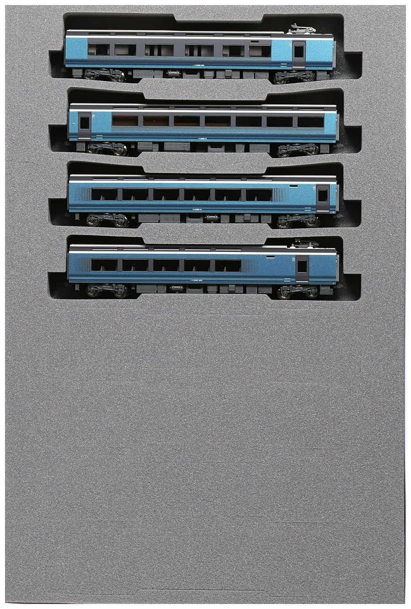4両基本セットは、発泡中敷+化粧箱、4両増結セットは、8両ブックケース(青色・基本セット車両収納可能) で設定