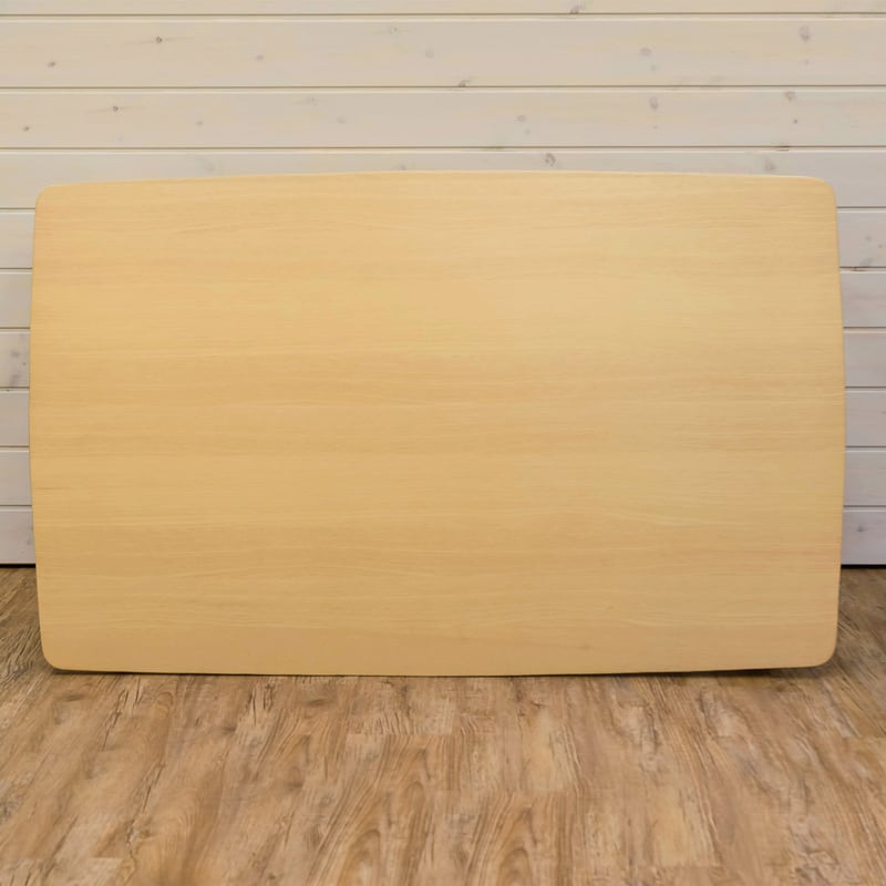 天板表面には明るく繊細な木目のホワイトアッシュ突板を使用しています(木目は商品ごとに異なります)。天板は全辺ストレートではなくラウンド形状です。 脚先にアジャスターが付いていますのでガタつきを調整出来ます。