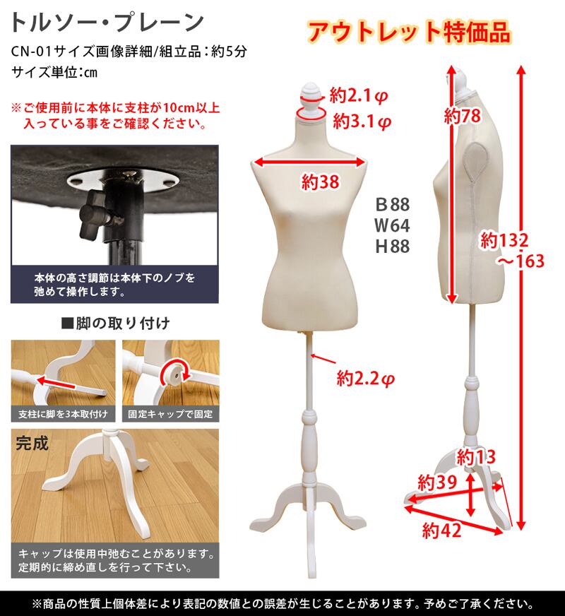 サイズ:幅420×奥行420×高さ1320~1630mm ボディサイズ(誤差有り):バスト88・ウエスト64・ヒップ88・肩幅38cm