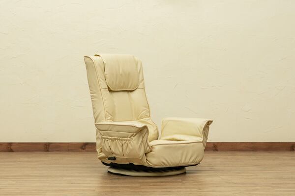 本体底面に回転盤があり、座面は360度回転します。肘掛けの右側のみポケットになっています。リモコンやスマホ等の収納に便利です。傷や汚れに強いPVCレザーを使用しています。