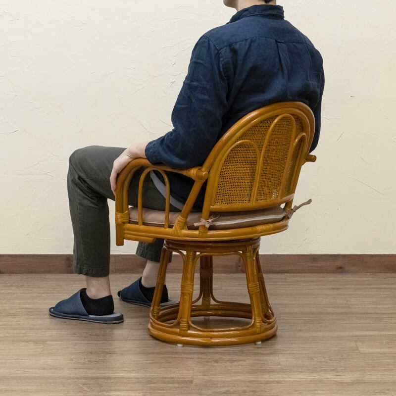 座面は360度回転します。クッションは紐で結んでいるだけなので取り外し出来ます。