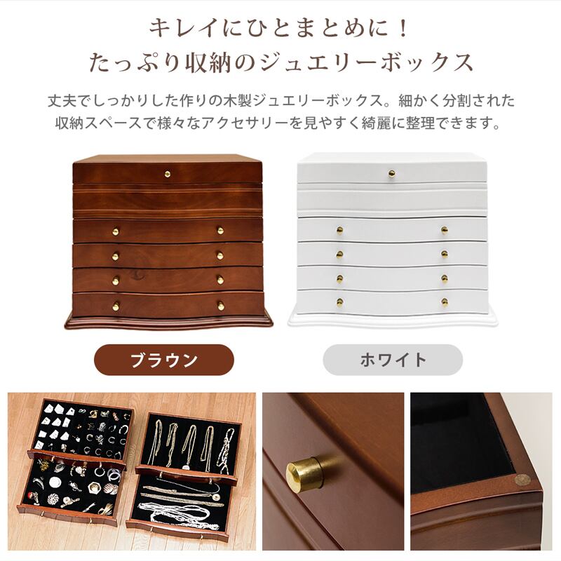 大切なアクセサリーを収納できる便利なアイテムです。お気に入りのアクセサリーに埃がつかないよう仕舞っておけます。内側はすべて、フエルト張りとなっているので傷付きにくく安心して収納できます。格段ごとに仕切りの仕様が異なりますのでアイテムに応じて整理整頓できます。引出しはそっくり抜き取れます。