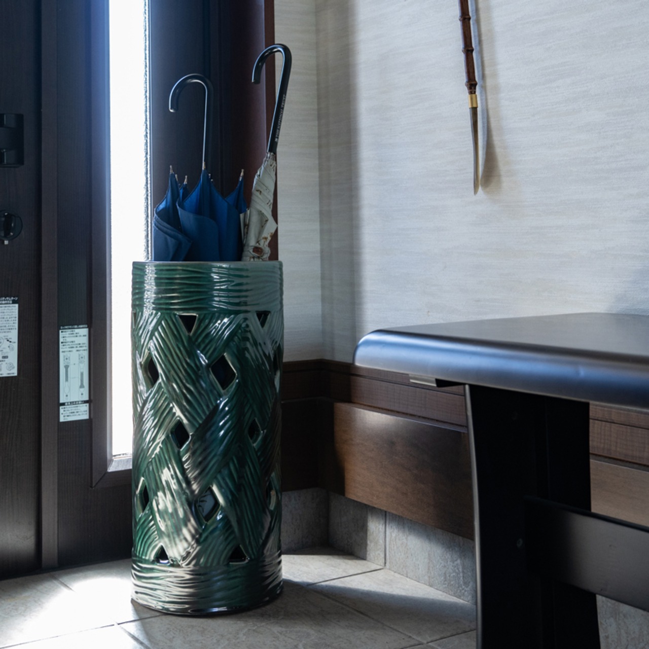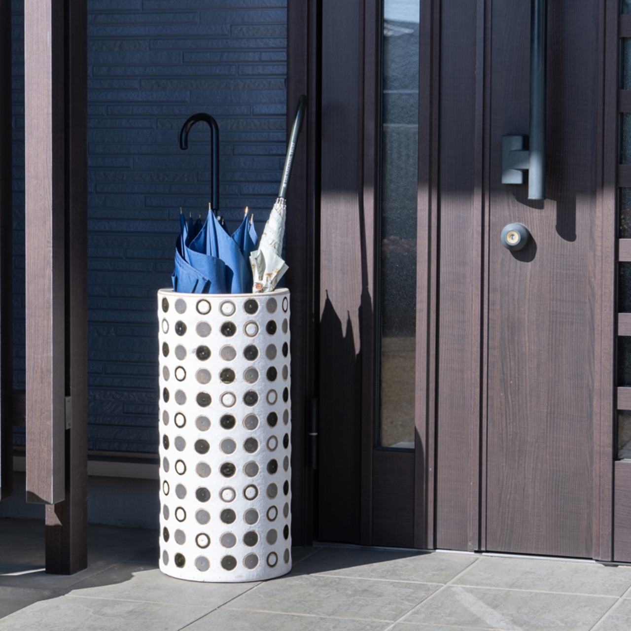 玄関に彩りを添える陶器傘立てです。個性的な3種類の柄の中からご自宅の雰囲気に合うものをお選びいただけます。傘を入れた時に割れないように、底面を保護するゴムクッションが付いています。。