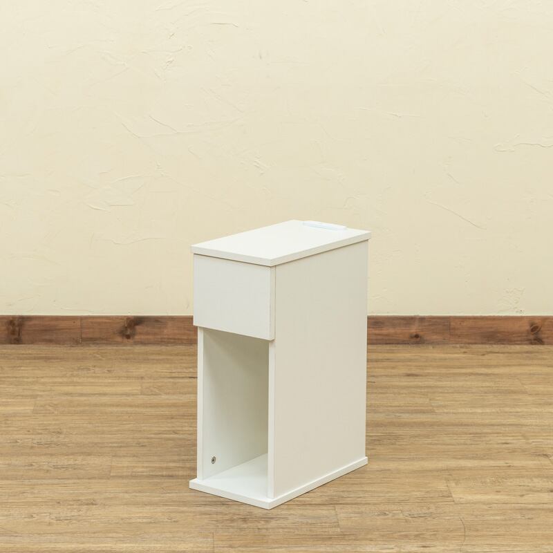 ベッドやソファサイドで役立つ幅約20センチとスリムなサイドテーブルです。雑誌や小物が置け、コンセント付きでスマホやタブレットの充電も出来ます。コンセントは埃の進入を防ぐ仕様になっています。ご使用の際は横にスライドさせながら差し込んで下さい。引出し1杯付きで細かなものを収納できます。最大に引き出しても、抜け落ち防止のストッパー付きです。
