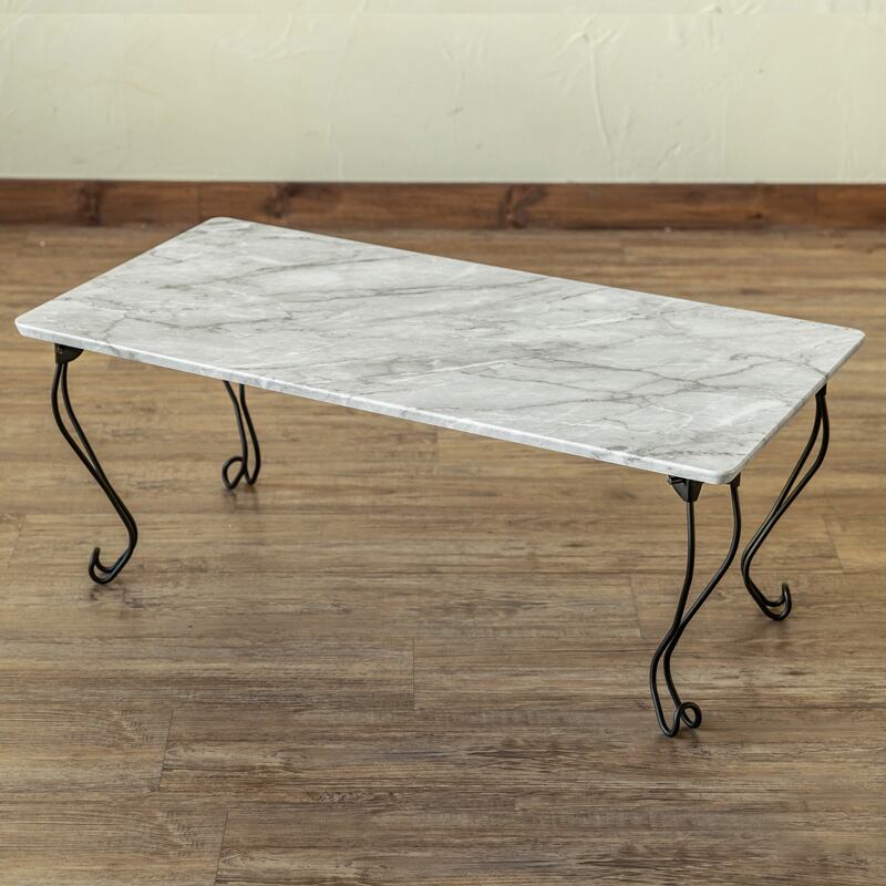 80×40cmの長方形天板です。天板の柄は個性的な石の模様と木目柄です。猫脚で可愛いフォルムです。脚は折りたたむと厚さ約8cmになり収納に便利です。
