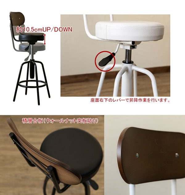 座面は360度回転します(固定されません)。座面の張り材はお手入れし易いPVCです。背もたれは強度の強い積層合板(ウォールナット突き板張り)です。足元は足が置ける仕様になっています。