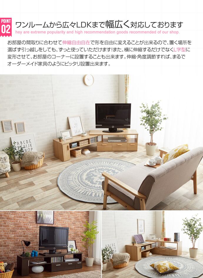 大人気のテレビボード。お部屋の広さやテレビサイズに幅広く対応出来る、伸縮型ローボード!収納力抜群で、リビング周りをスッキリさせるテレビボードです。