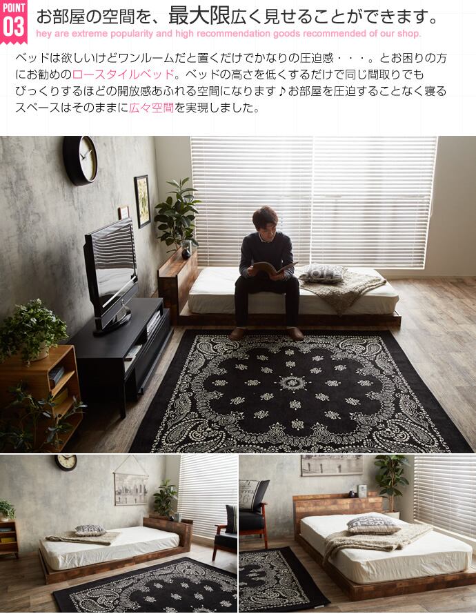 存在感抜群の人気のローベッドです。存在感のあるお洒落な寄木柄がポイント♪ロースタイルなので圧迫感がなく一人暮らしの方などお部屋を広く使いたい方にはおすすめの商品です!小物置きに便利な宮棚やコンセントも付いているので枕元で携帯の充電ができるのも嬉しいですよね♪