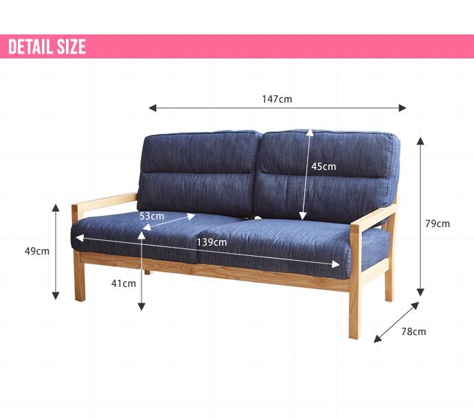 やわらかなデニム生地を使用したラフでカジュアルな二人掛けソファです。西海岸テイストのナチュラルかつスタイリッシュなデザインでお部屋がオシャレなイメージに!天然木のフレームに座面・背もたれクッションを置いただけのシンプルな構成で組立も簡単です!
