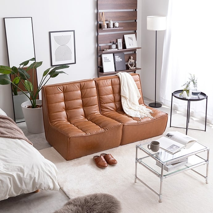 海外インテリアのような『Hank(ハンク)』PVCレザーソファ2脚。クロスステッチが施されたレザー調の張地と厚みのあるフォルムは、お部屋に置くだけで主役になるほど存在感抜群です。個性的ながらもシンプルなフォルムは、ヴィンテージモダンはもちろん北欧など様々なスタイルにマッチします。