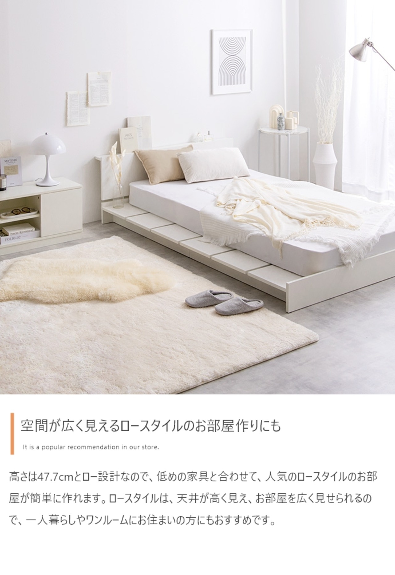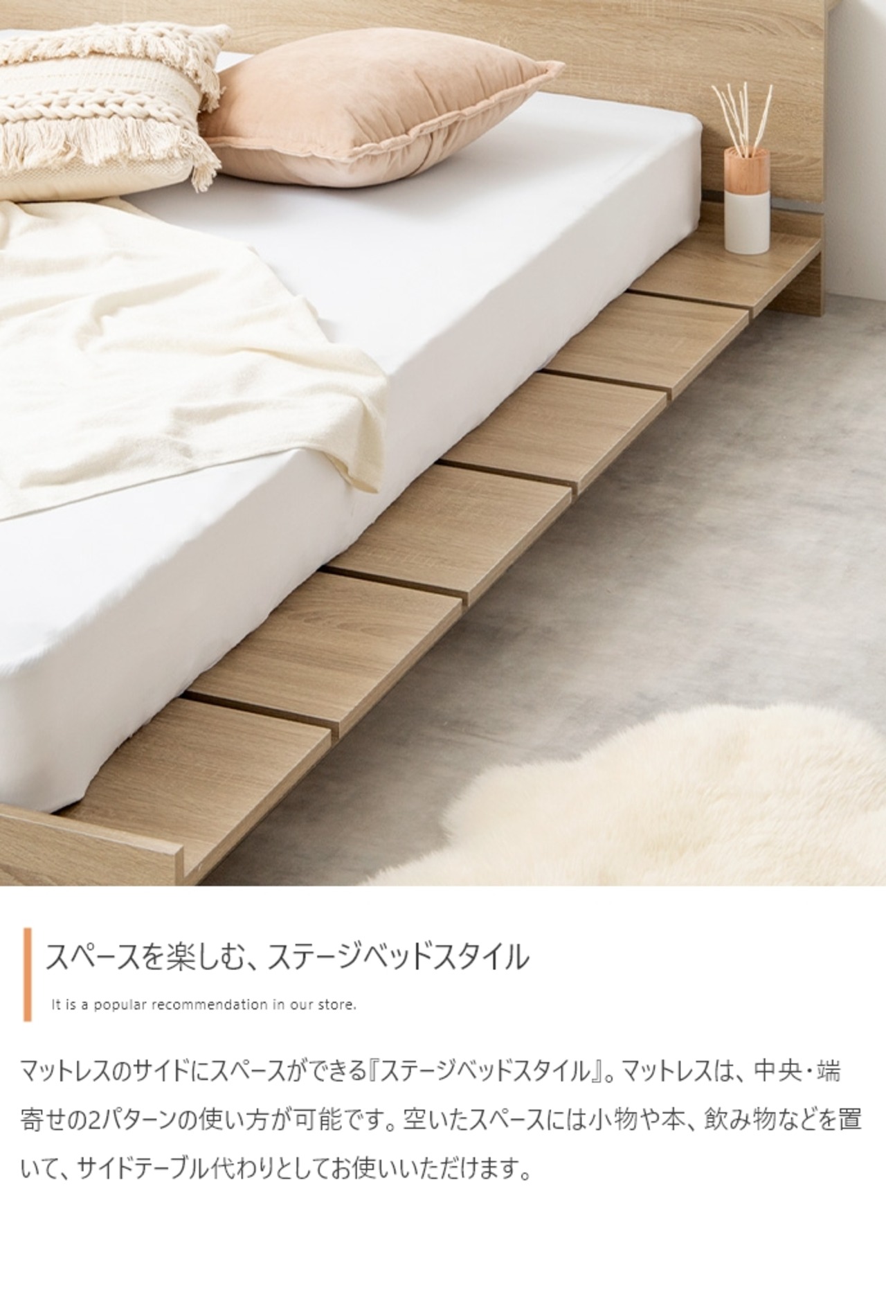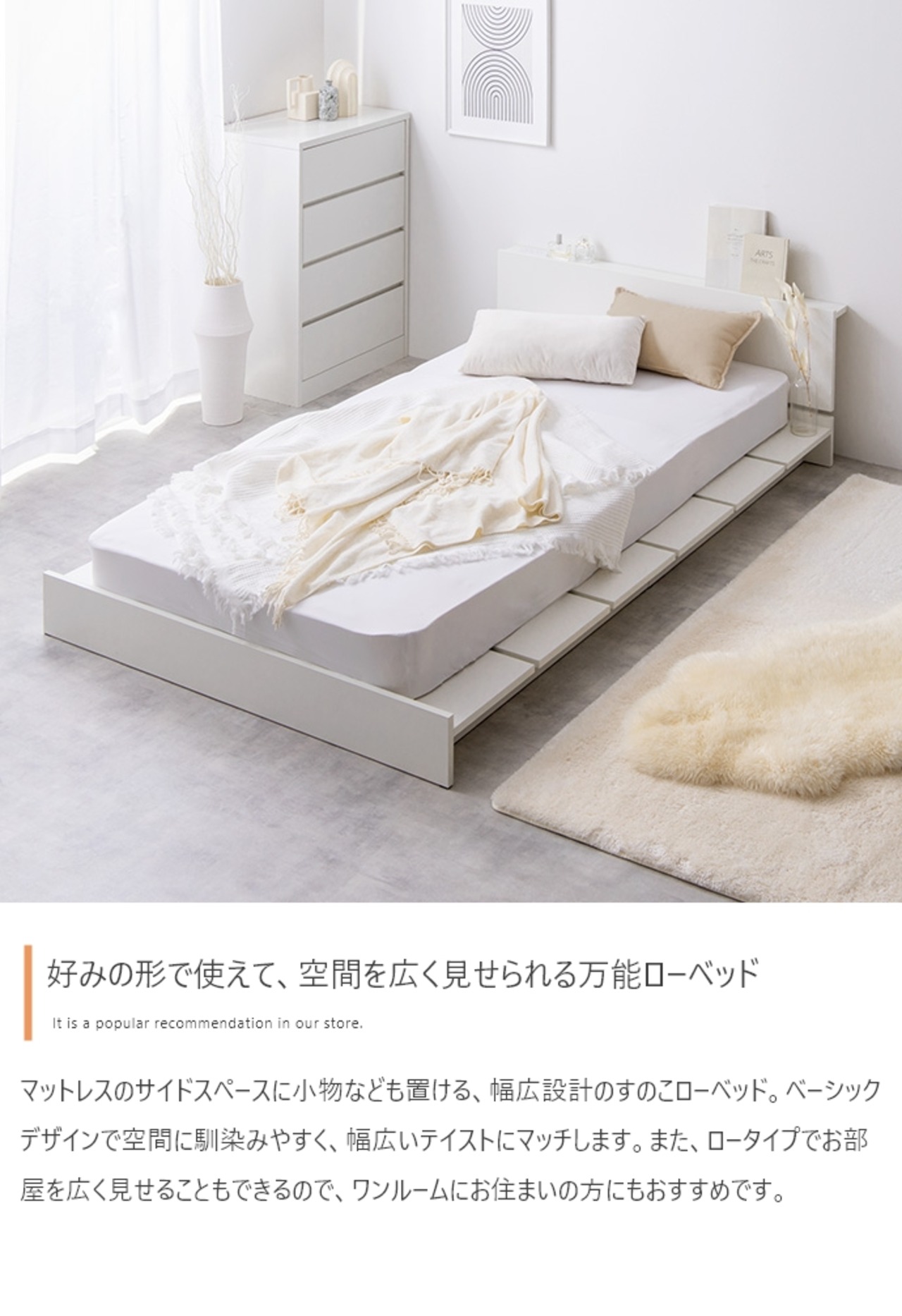 好きなスタイルで使えて、人気のロースタイルのお部屋も作れる『Yuseong(ユソン)』幅広すのこローベッド。マットレスのサイドにはスペースができる幅広設計で、小物や本などを置いていただけます。また、ロータイプで空間を広く見せることができるので、ワンルームやスペースに余裕のないお部屋にお住まいの方にもおすすめです。