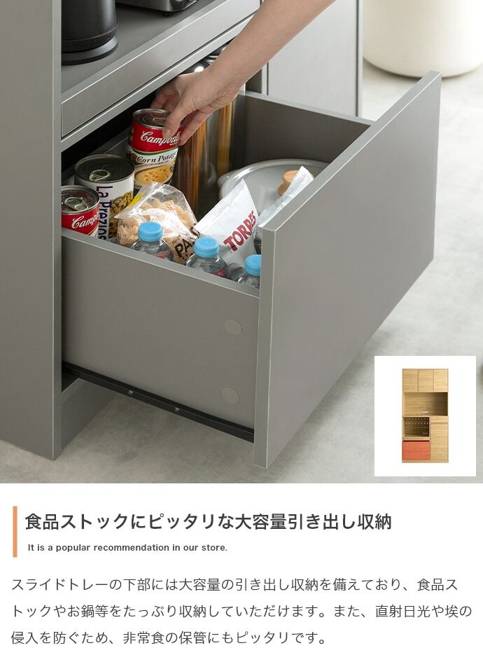 【耐荷重】オープン収納:約10kg、スライドトレー:約5kg、上段左扉収納・可動棚:約3kg、上段左扉収納・底板:約5kg、上段右扉収納・可動棚:約3kg、上段右扉収納・底板:約10kg、下段扉収納・棚板:約3kg、下段扉収納・底板:約10kg、引き出し収納(小):約3kg、引き出し収納(大):約5kg