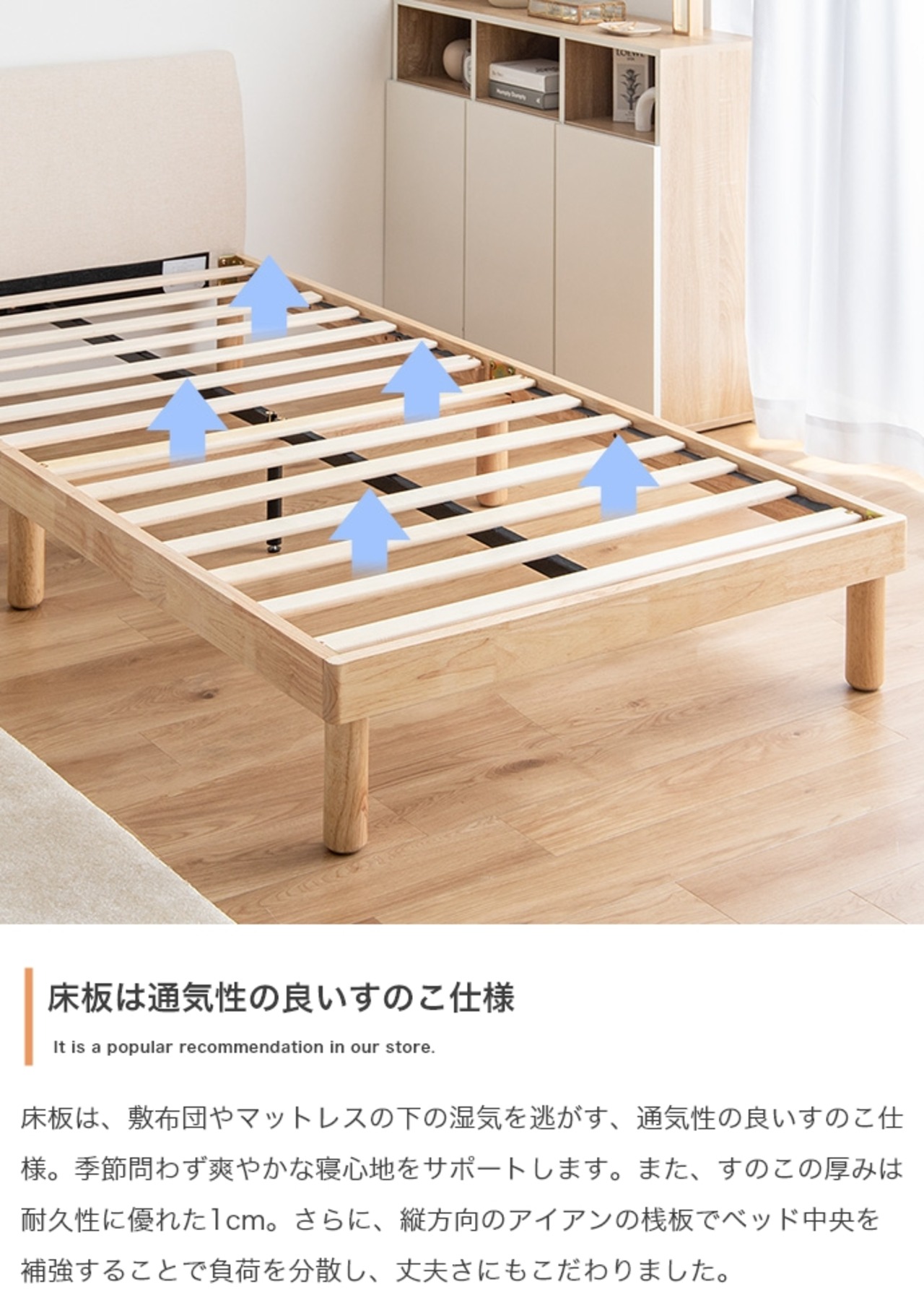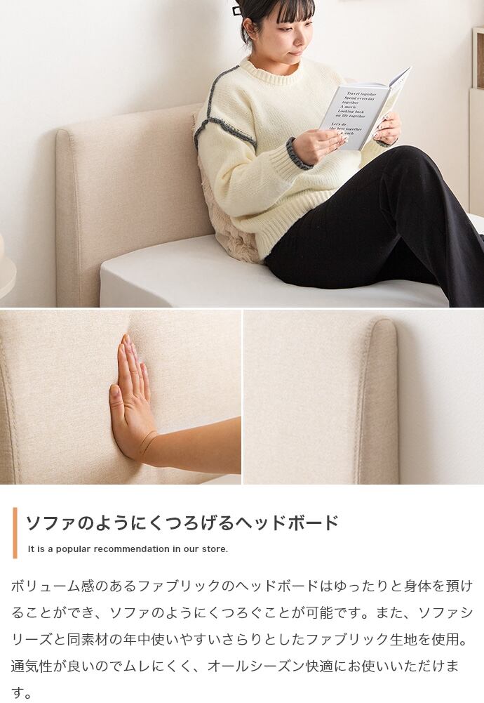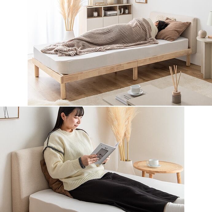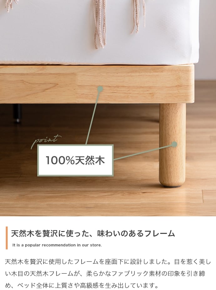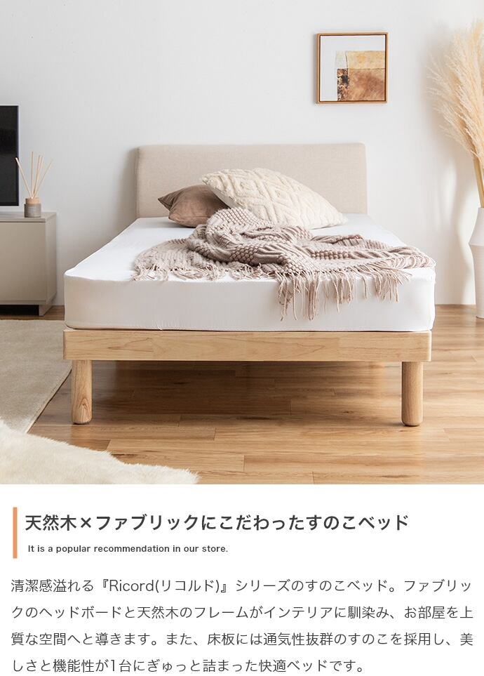 清潔感あふれる「天然木」×「ファブリック」にこだわった『Ricordo(リコルド)』シリーズのすのこベッド。ファブリックのヘッドボードと100%天然木のフレームがインテリアに馴染み、お部屋を上質な空間へと導きます。また、床板には通気性抜群のすのこを採用し、美しさと機能性が1台にぎゅっと詰まった快適ベッドです。