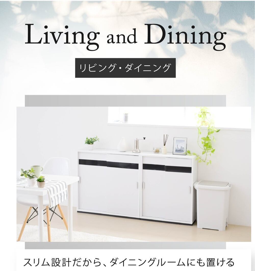 奥行き22cmのスリムタイプなカウンター下収納引き戸タイプ幅60。高さは80cmなので、カウンター下収納としてだけでなく、リビング収納としてもぴったり。可動式の棚板付きで、食器等はもちろん、CDやDVD、コミックも綺麗に収納。配線孔がついているのでルーター収納としてもご使用できます。