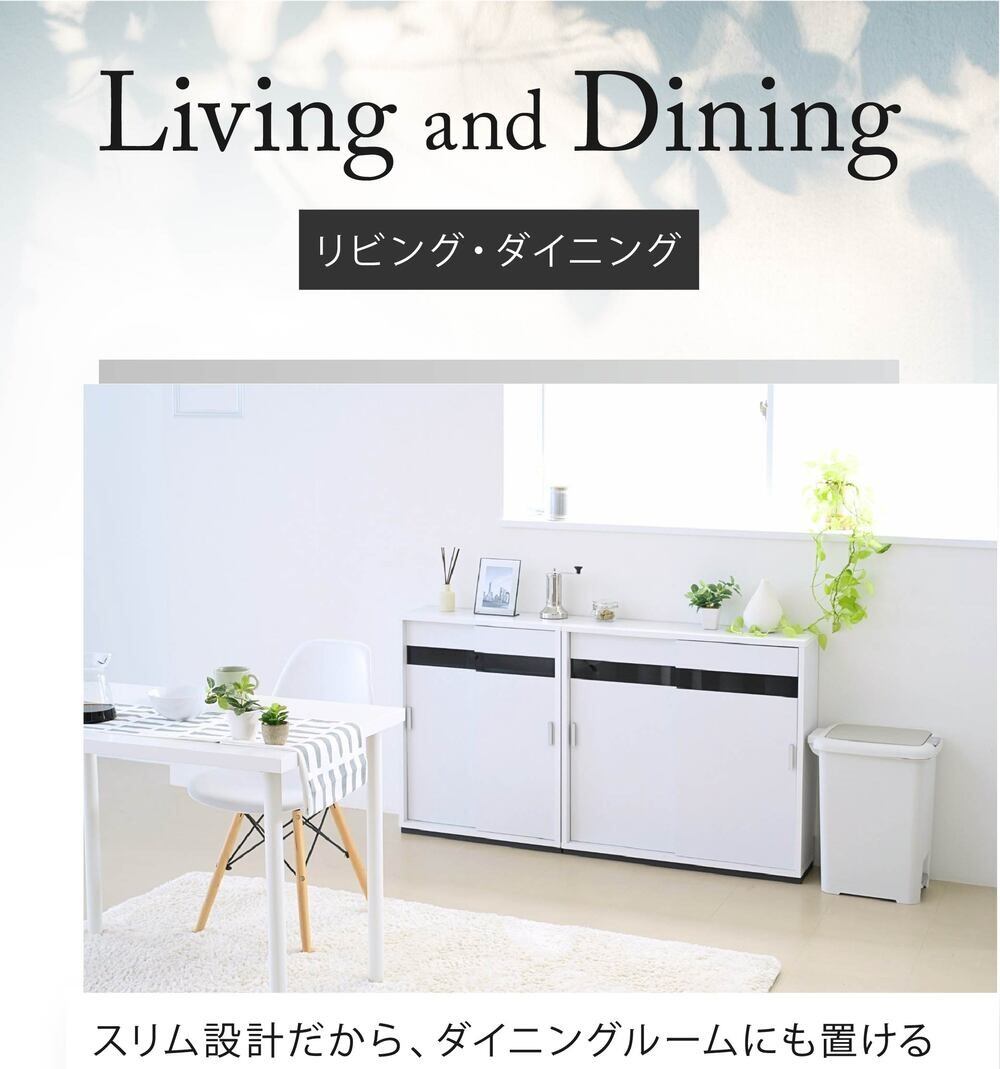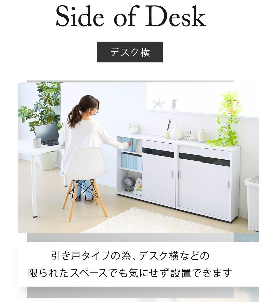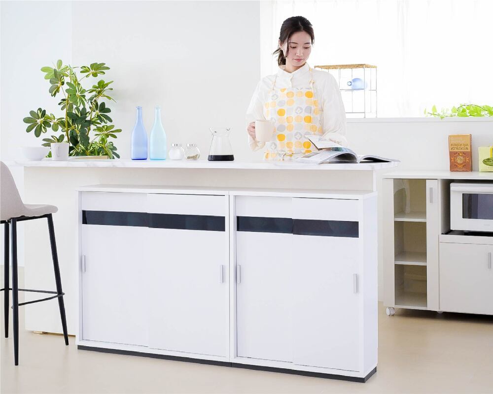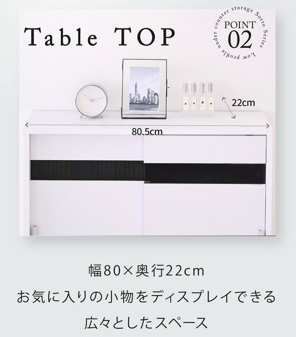奥行き22cmのスリムタイプなカウンター下収納引き戸タイプ幅80。高さは80cmなので、カウンター下収納としてだけでなく、リビング収納としてもぴったり。可動式の棚板付きで、食器等はもちろん、CDやDVD、コミックも綺麗に収納。配線孔がついているのでルーター収納としてもご使用できます。