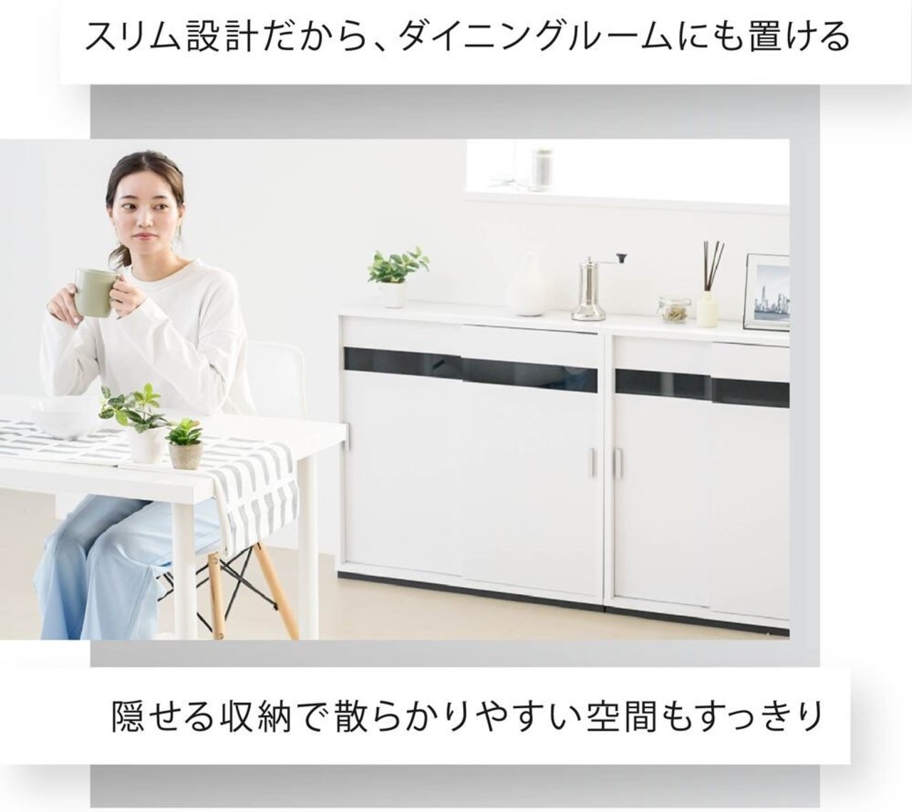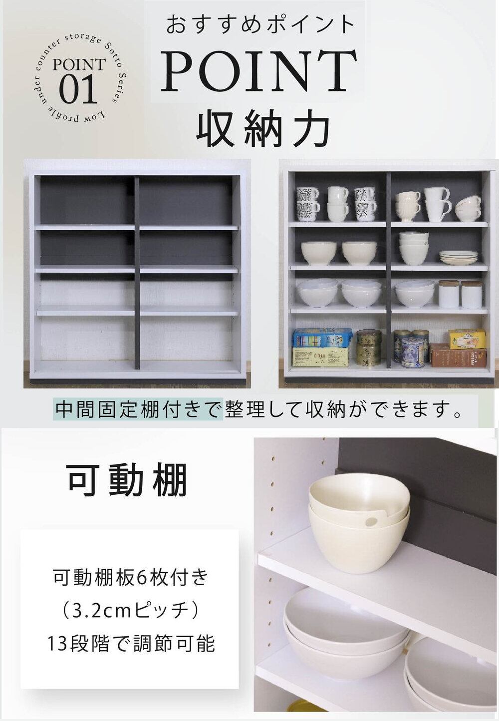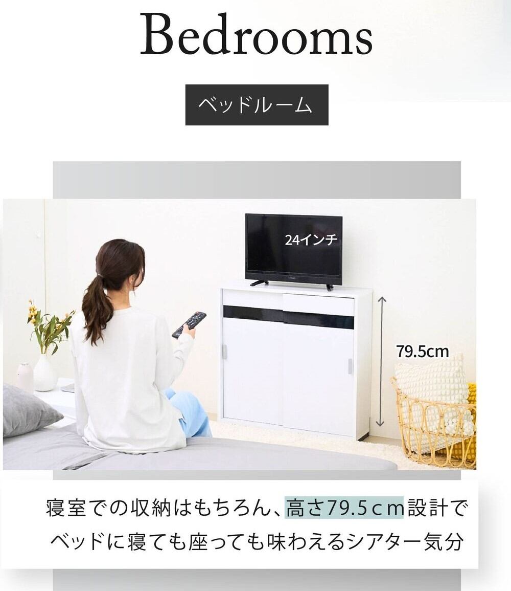 奥行き22cmのスリムタイプなカウンター下収納引き戸タイプ幅80。高さは80cmなので、カウンター下収納としてだけでなく、リビング収納としてもぴったり。可動式の棚板付きで、食器等はもちろん、CDやDVD、コミックも綺麗に収納。配線孔がついているのでルーター収納としてもご使用できます。