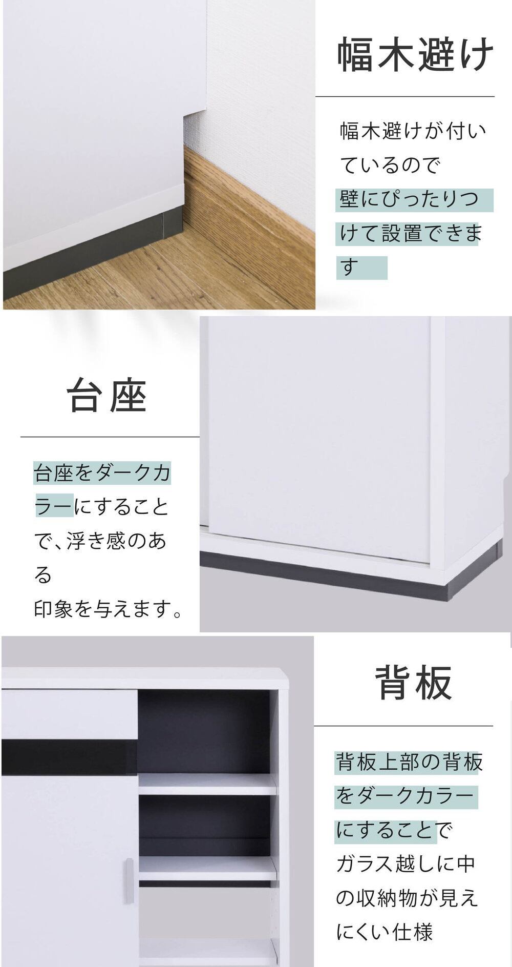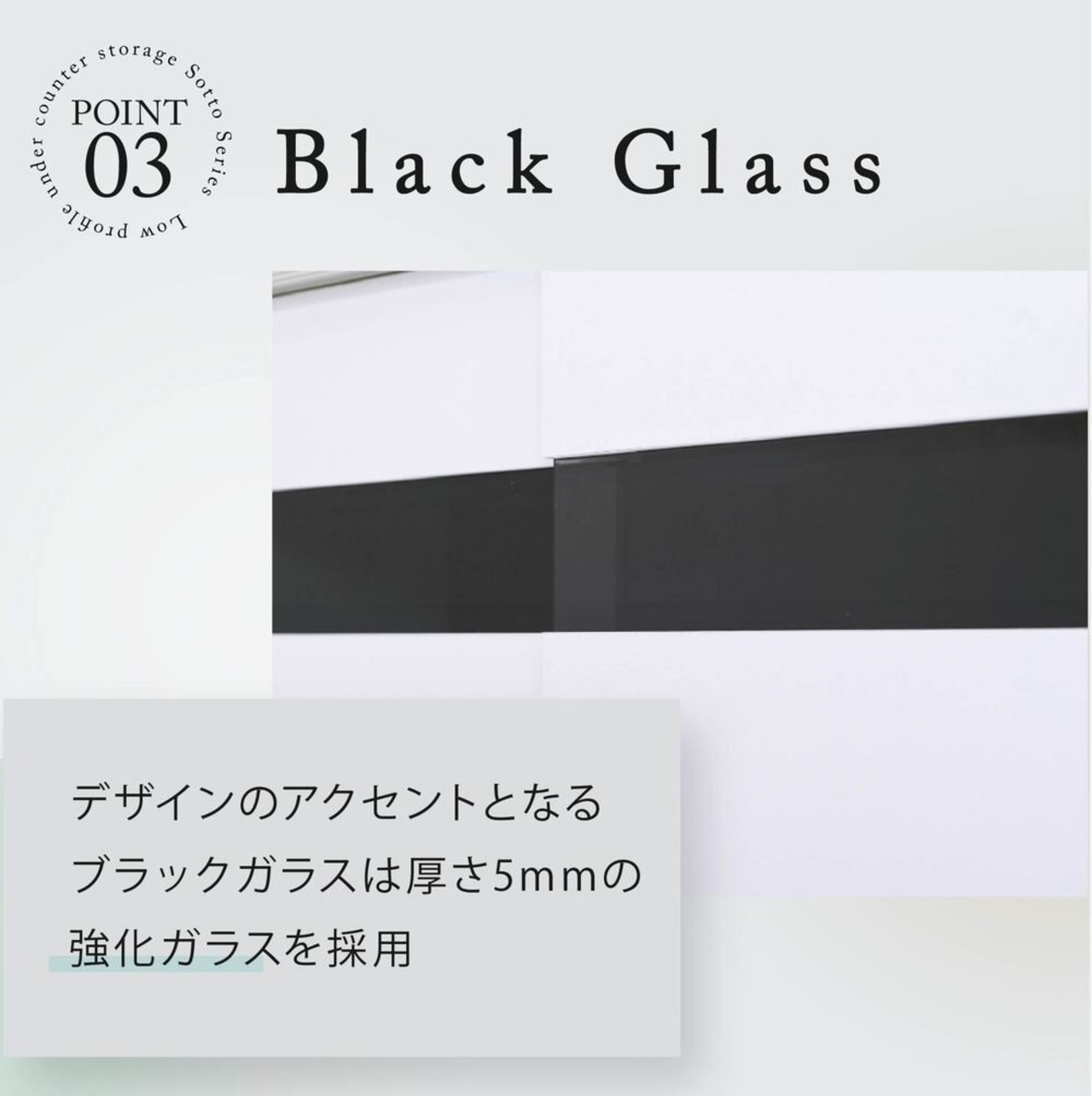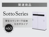 置く場所を選ばずスマートに収納できるカウンター下引き戸収納”Sotto”。引き戸にはブラックガラスを使用。シンプルながらも重厚感ある仕上がりの隙間収納キャビネット