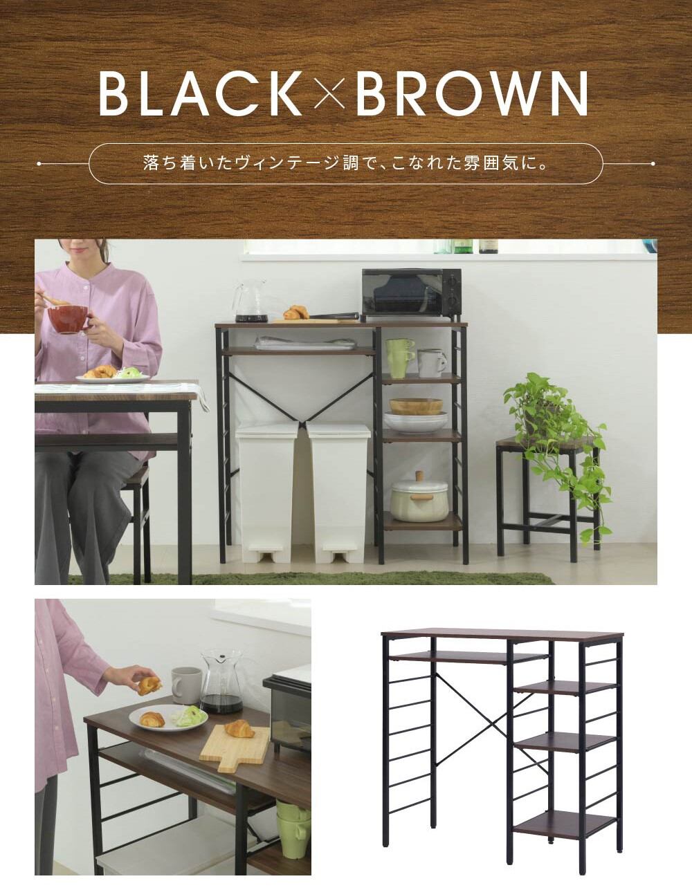 幅90cmの広々作業スペースとゴミ箱収納ができるキッチンカウンター。奥行き40cmなので、大きめの電子レンジなど置くこともできます。サイドの収納スペースは可動棚なので、収納するものに合わせて高さ調整が可能なラック。サイドフレームにはS字フックなどを使うことで、ちょこっと掛けにご活用いただけます。