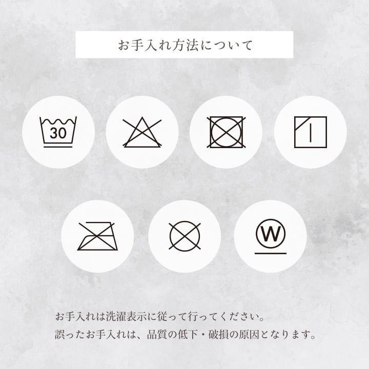 洗濯表示:液温は30℃を限度とし、洗濯機で弱い洗濯ができる。